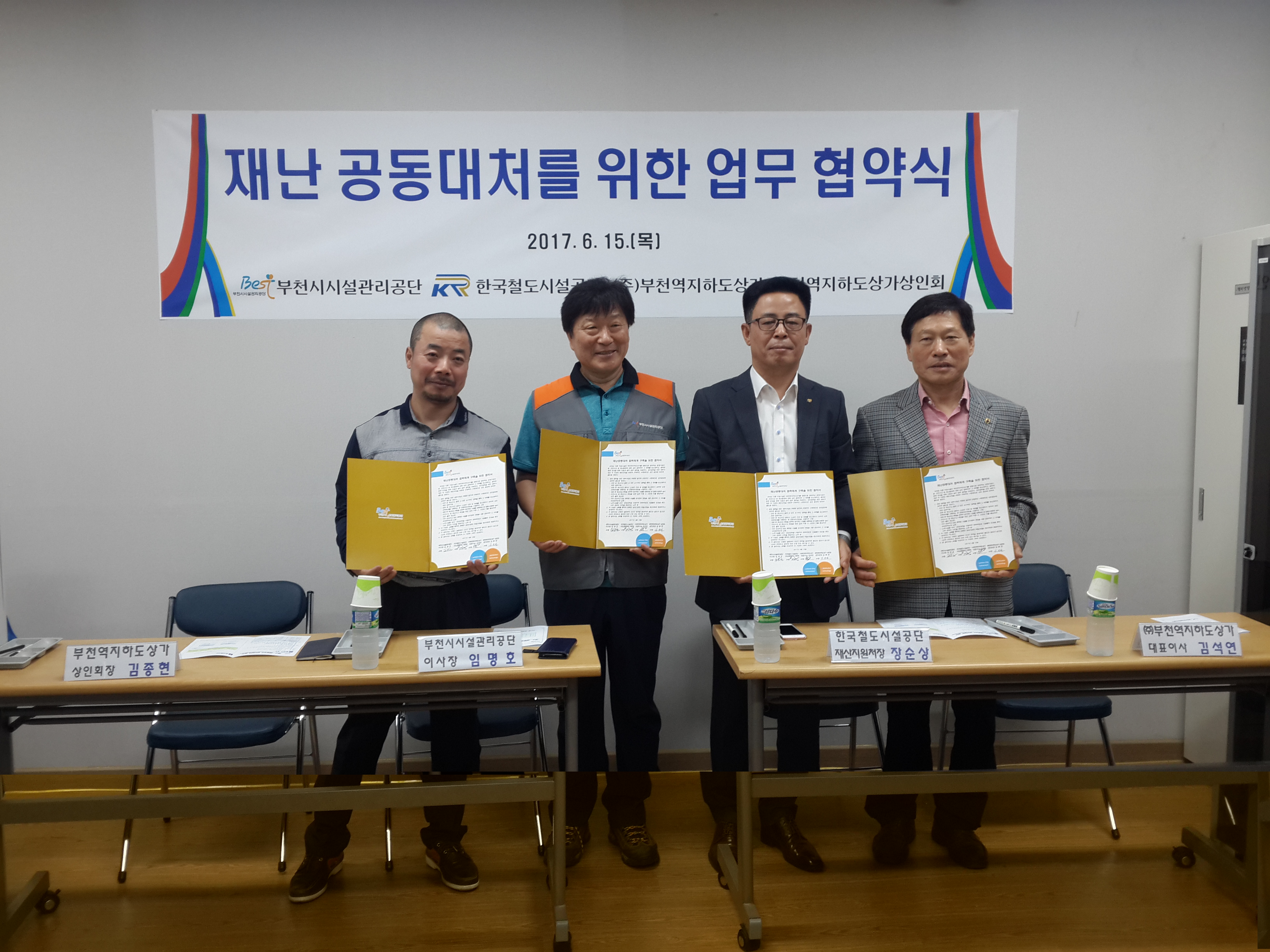 철도공단 수도권본부, 부천역지하도상가 재난대처 협력체계 구축 - 부천역지하도상가 관리·운영기관 3사와 업무협약으로 재난관리 공동대응 - □ 한국철도시설공단 수도권본부(본부장 이현정)는 부천역지하도상가의 재난발생 시 신속한 대응을 위하여 6월 15일(목) 부천역지하도상가 관리·운영기관 3사(부천시시설관리공단, ㈜부천역지하도상가, 부천역 지하도상가 상인회)와 업무협약을 체결했다고 밝혔다. ○ 부천역지하도상가는 1978년 기부채납 방식으로 건설되어 현재 총237개 점포(공단 소관 93개, 부천시 소관 144개)를 각각 ㈜부천역지하도상가와 부천시시설관리공단이 수탁관리하고 있다. ○ 부천역지하도상가를 공동 관리중인 공단과 부천시는 이번 협약을 계기로 노후 시설물 합동점검은 물론, 안전관리를 더욱 강화하고 재난피해를 최소화하기 위한 협력체계를 구축한다. ○ 또한, 재난발생 시 관리주체 이원화로 인한 대응혼선을 방지하고, 안전대책을 마련하여 관리 사각지대를 해소할 것으로 기대된다. □ 이현정 본부장은 “부천역지하도상가는 경인선 철도 역사가 담긴 문화재로써 지역사회에 상징하는 바가 크다”며, “앞으로 철도안전뿐만 아니라 지하도상가 상인, 주민들을 위해 안전한 국유재산 운영을 위해 앞장서겠다”고 말했다.